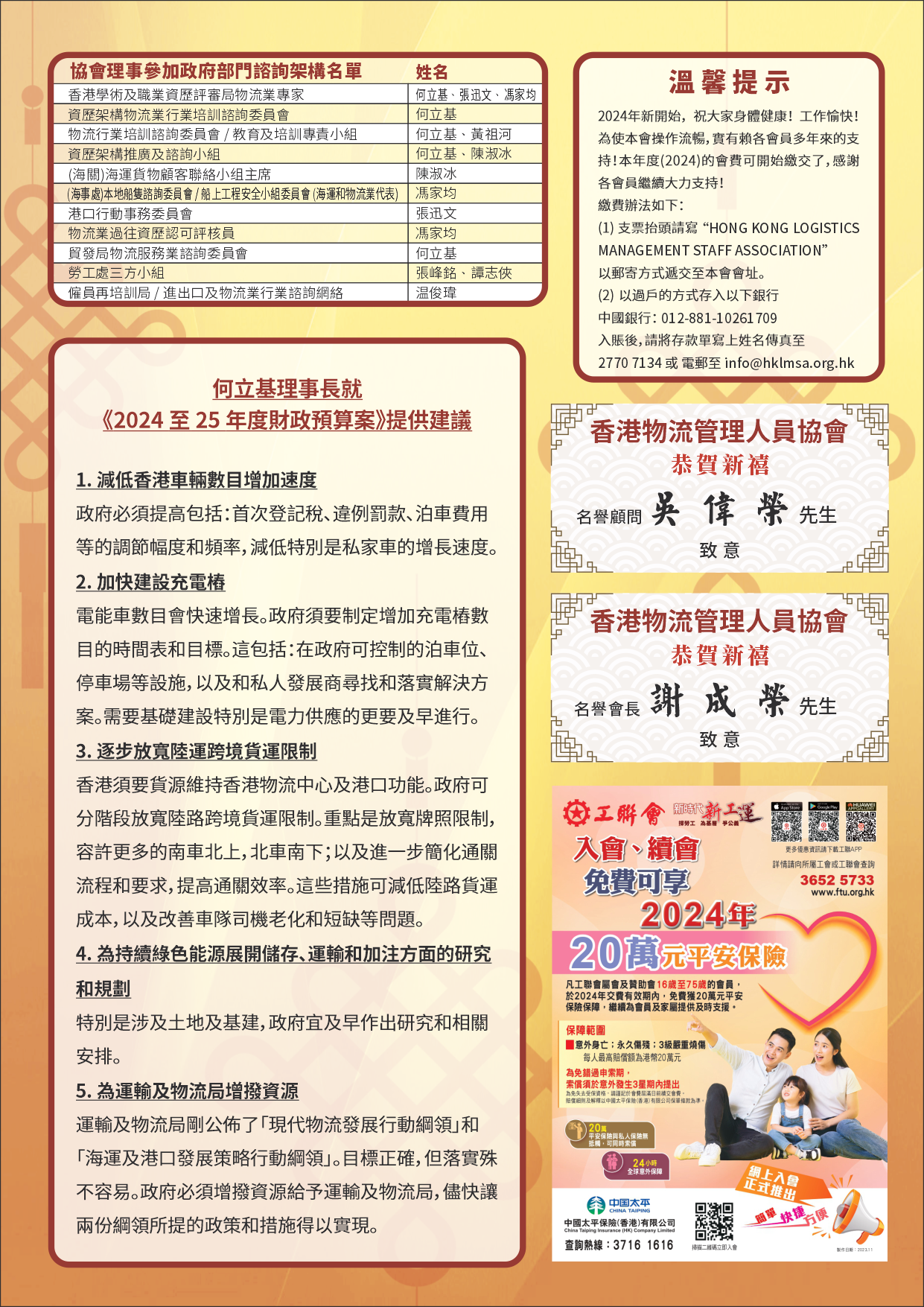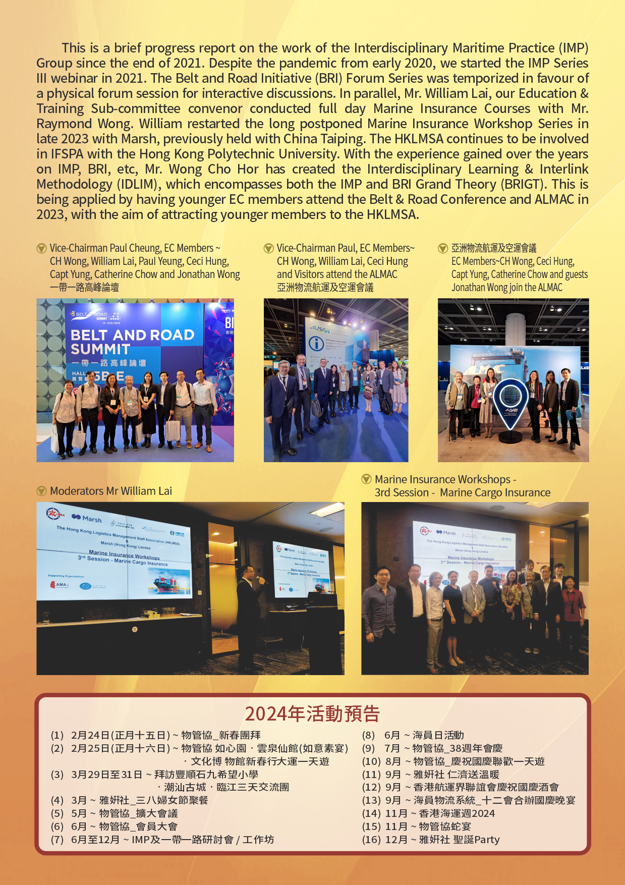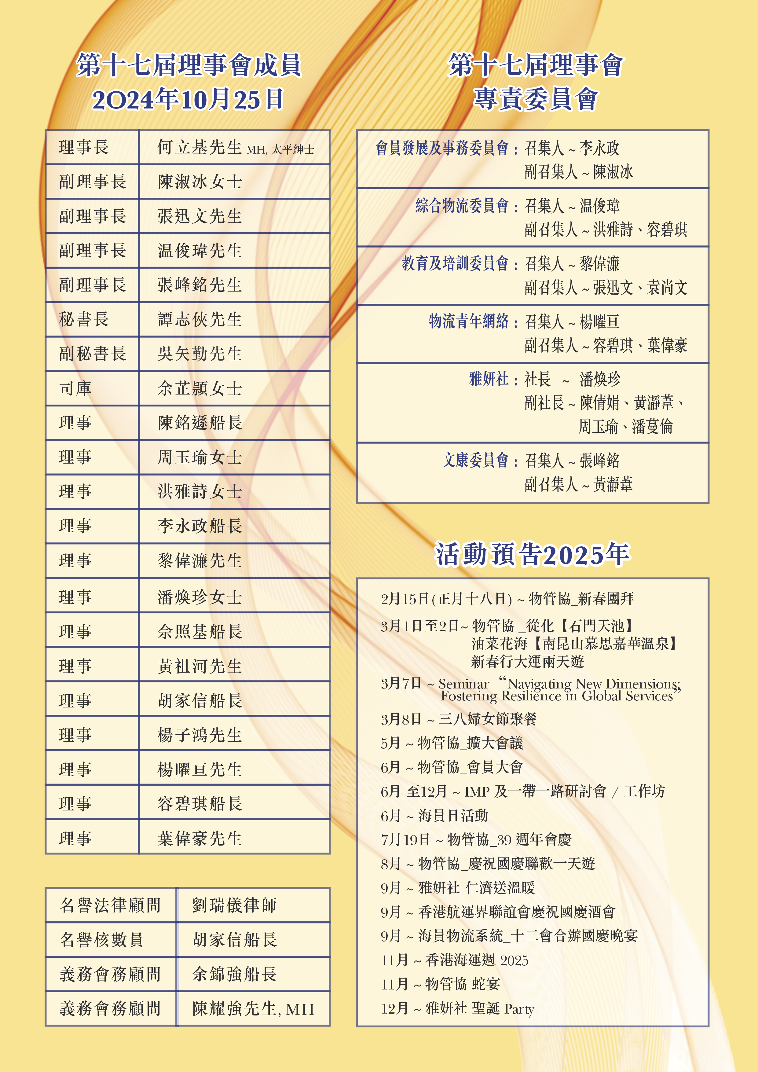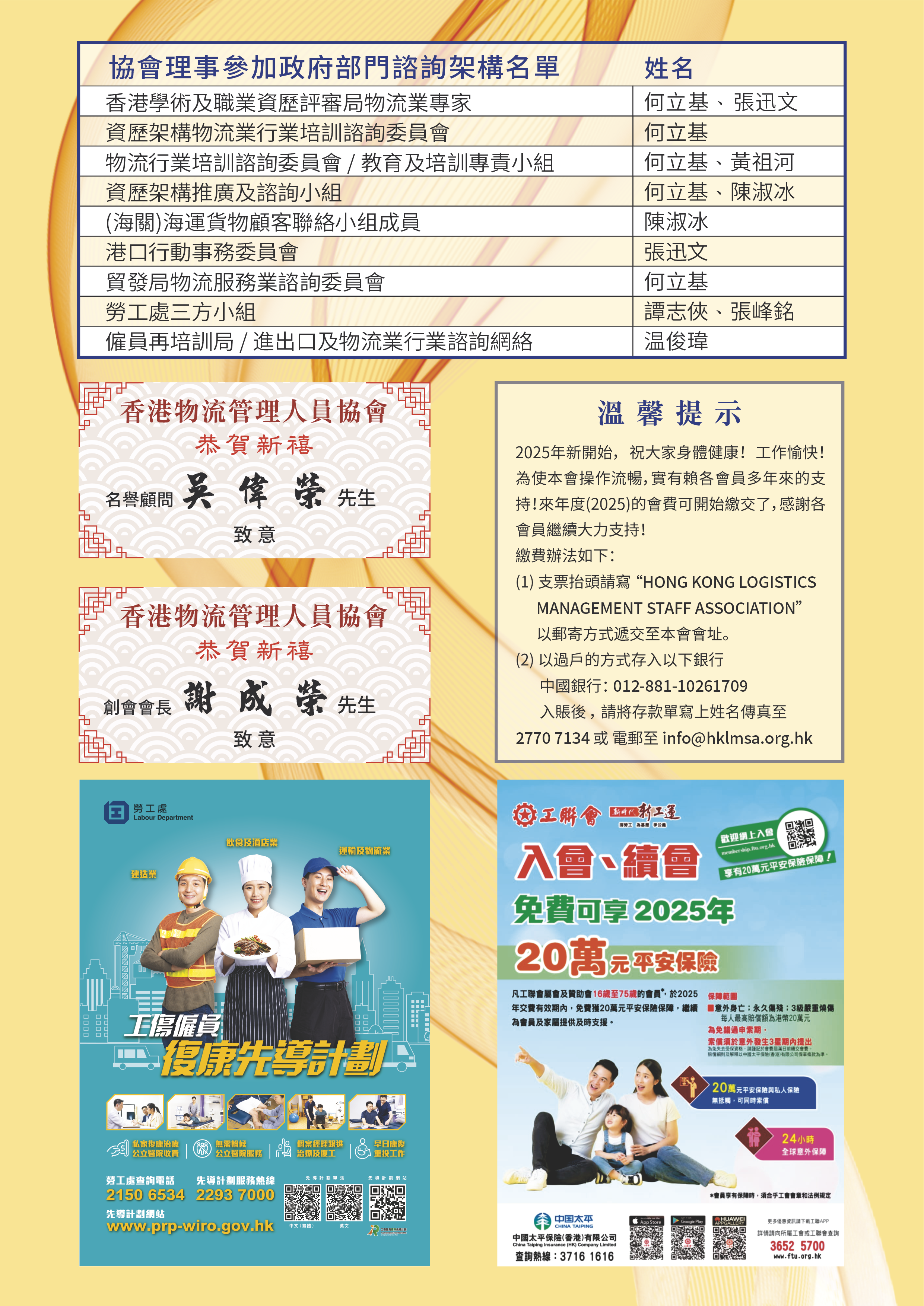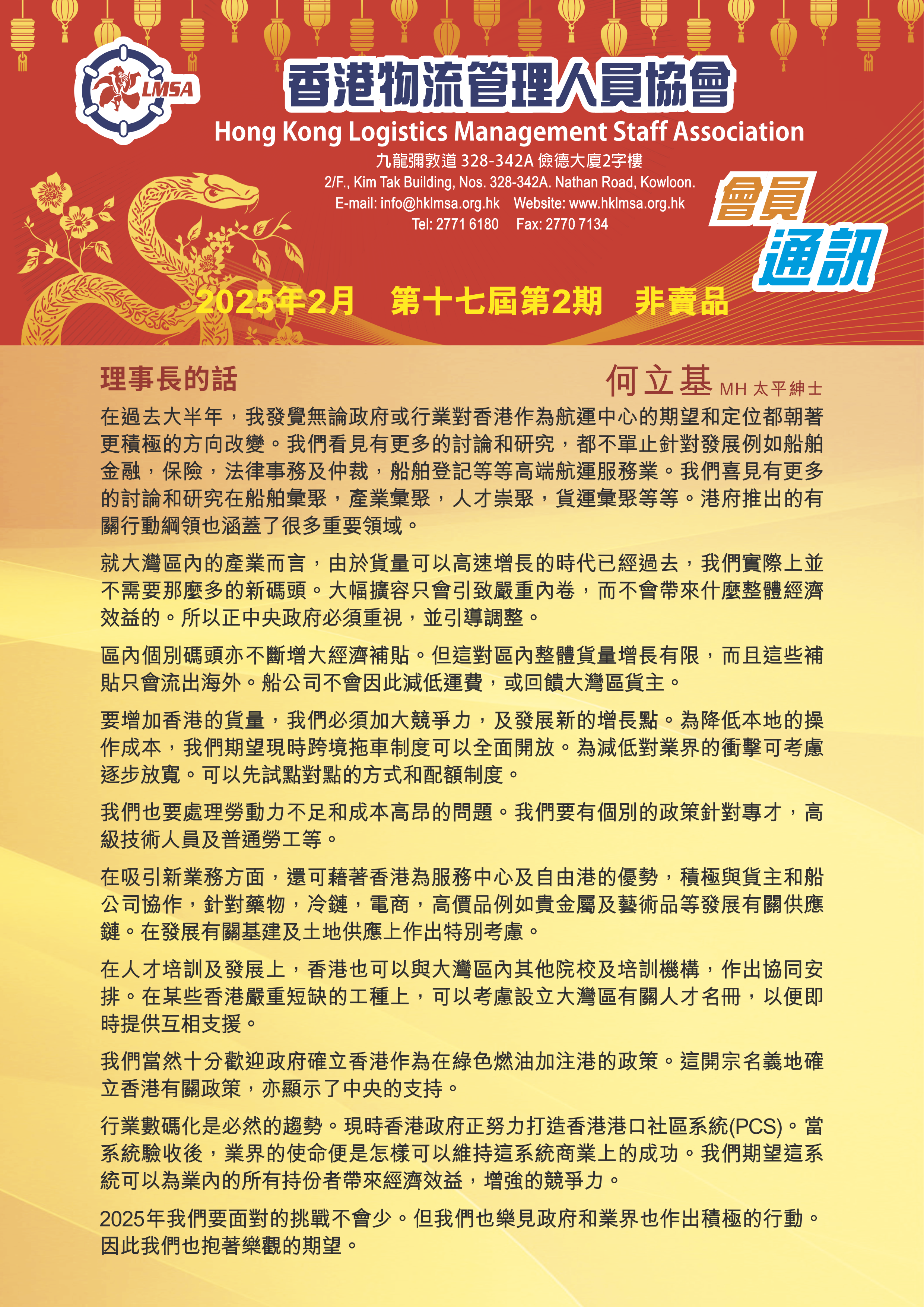 Anniversary Commemoration Publication records our contribution works for the past year and also compiles and consolidates the growth and contribution of our shipping and logistics practitioners with the most updated situation about the logistics industry. HKLMSA is intended to serve as a role as a bridge among the industry with a positive significance to explore the prospects and future of Hong Kong shipping and logistics industry. Therefore, the association decides to publish the Anniversary Commemoration Publication at every fifth and tenth anniversary and hope to be supported by our members and the industry continuously!
